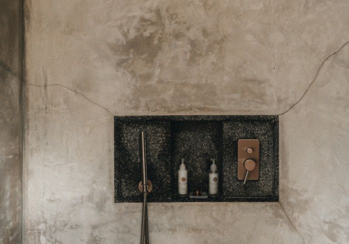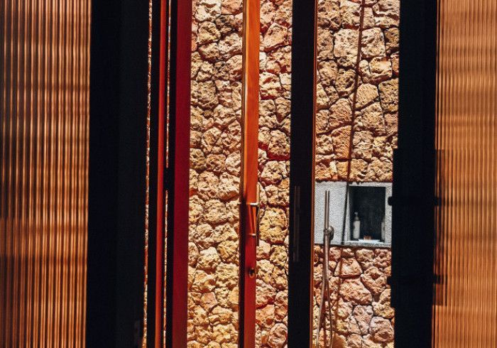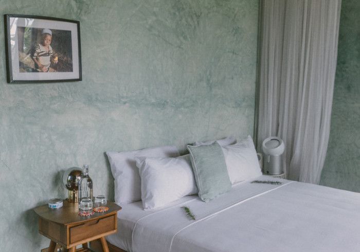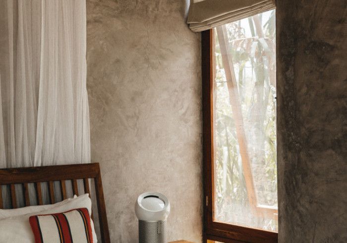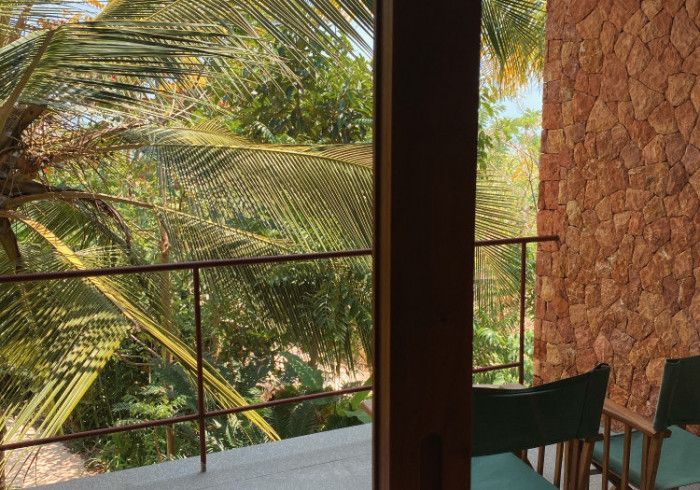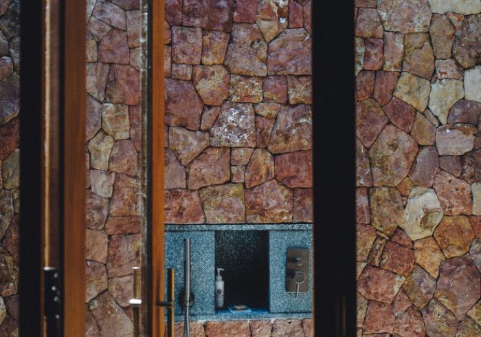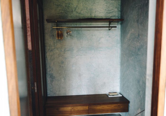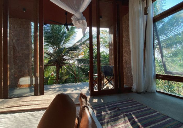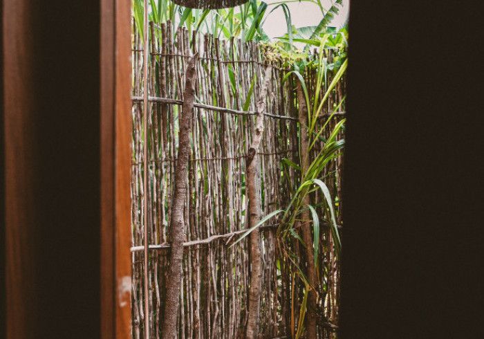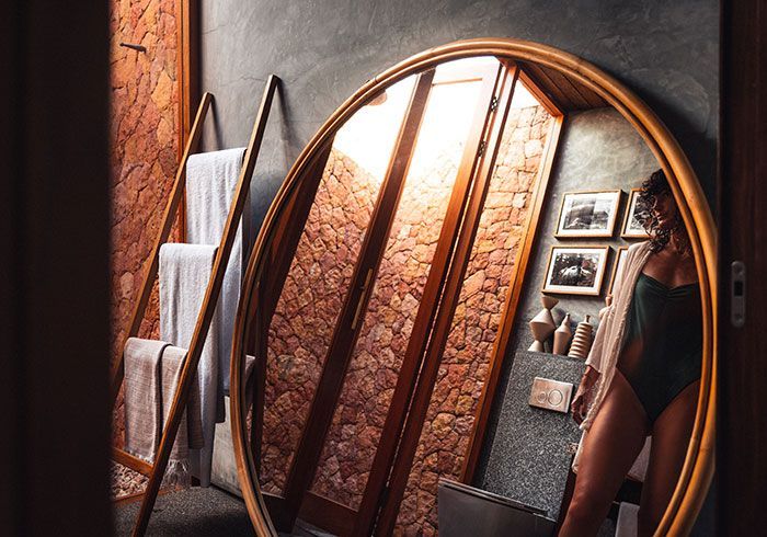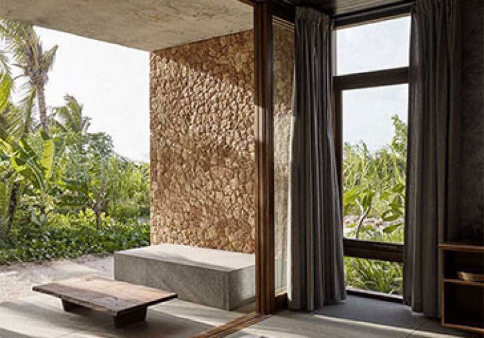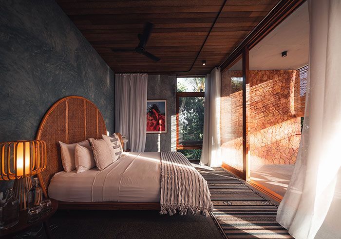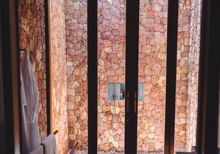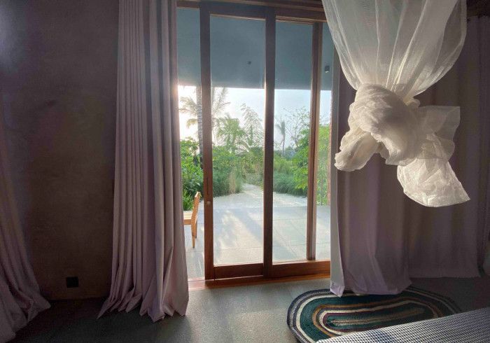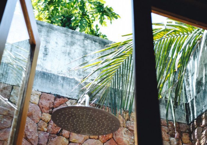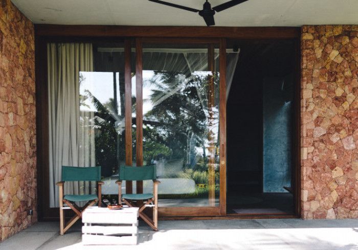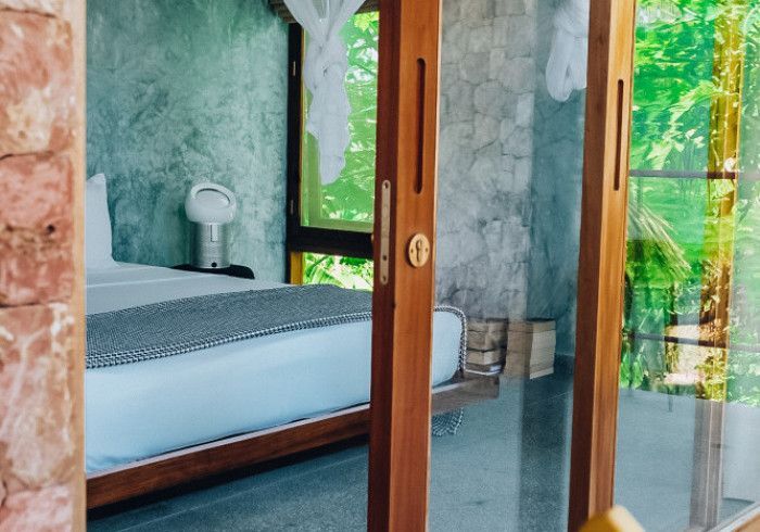 features indulgent indoor + outdoor showers + AC + nespresso machine + kettle + king sized coco-mat mattress, a few of shahi's favourite books and a record player.