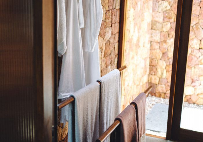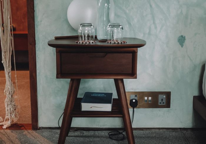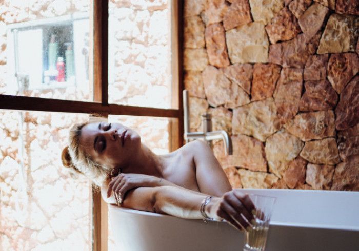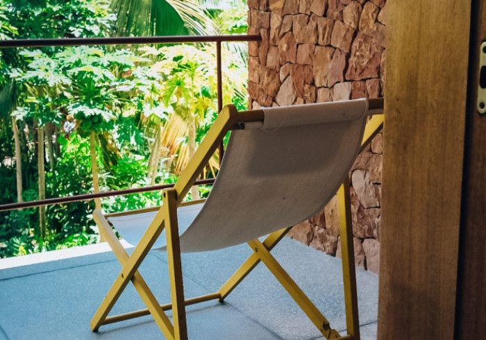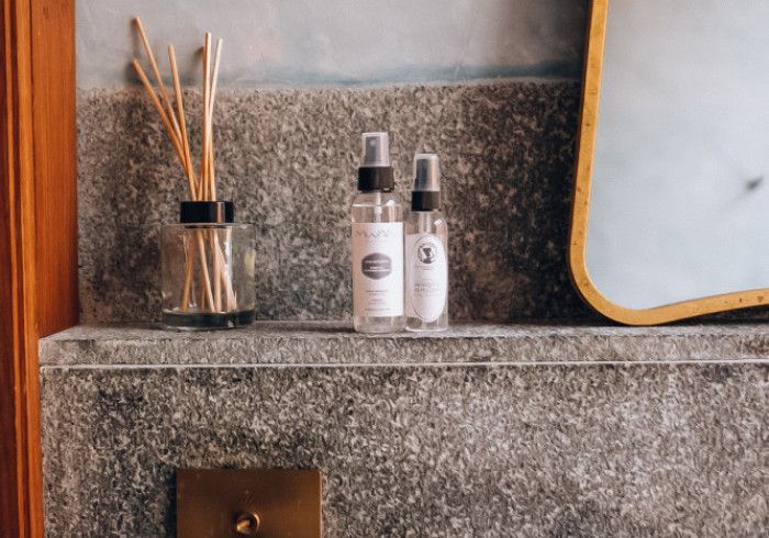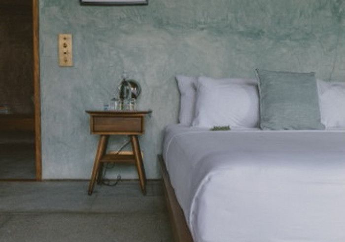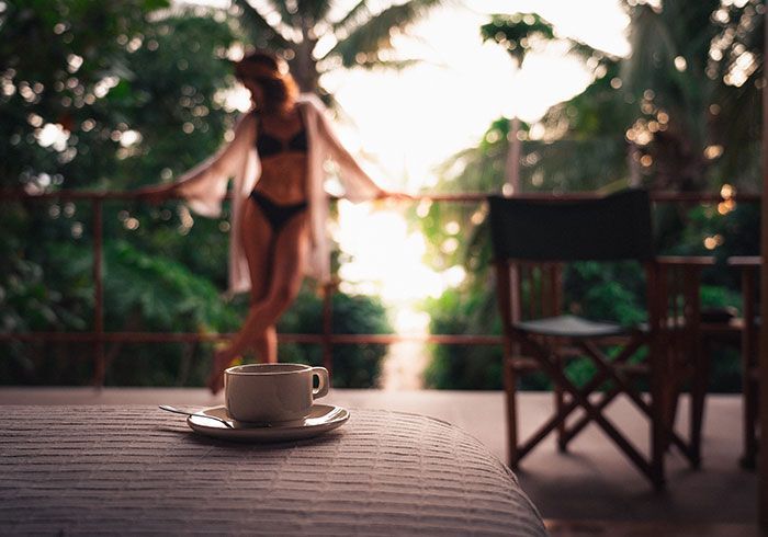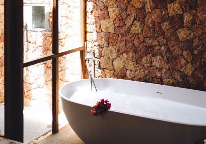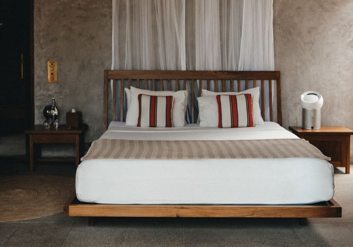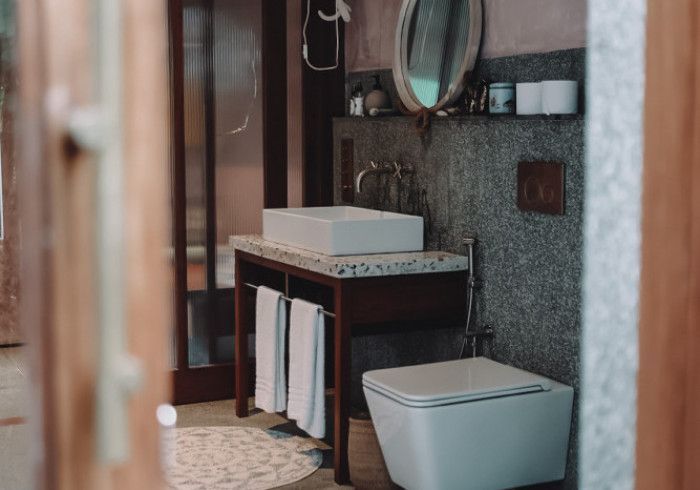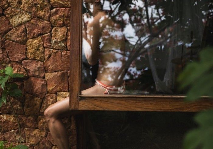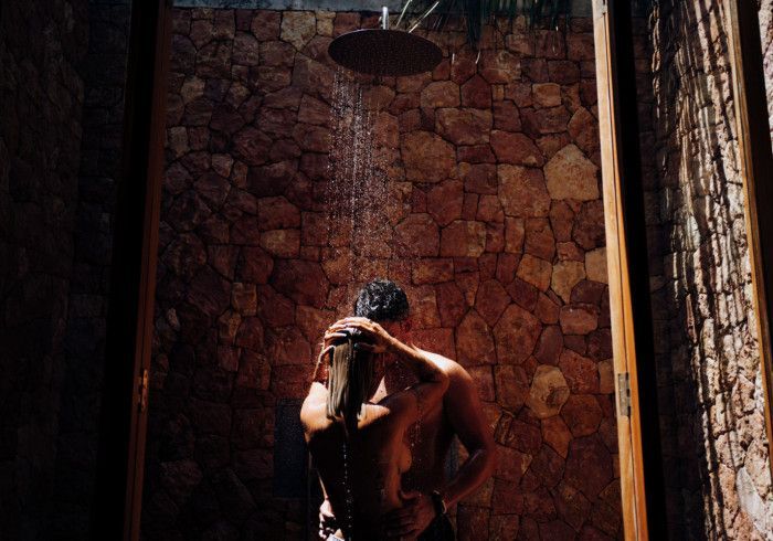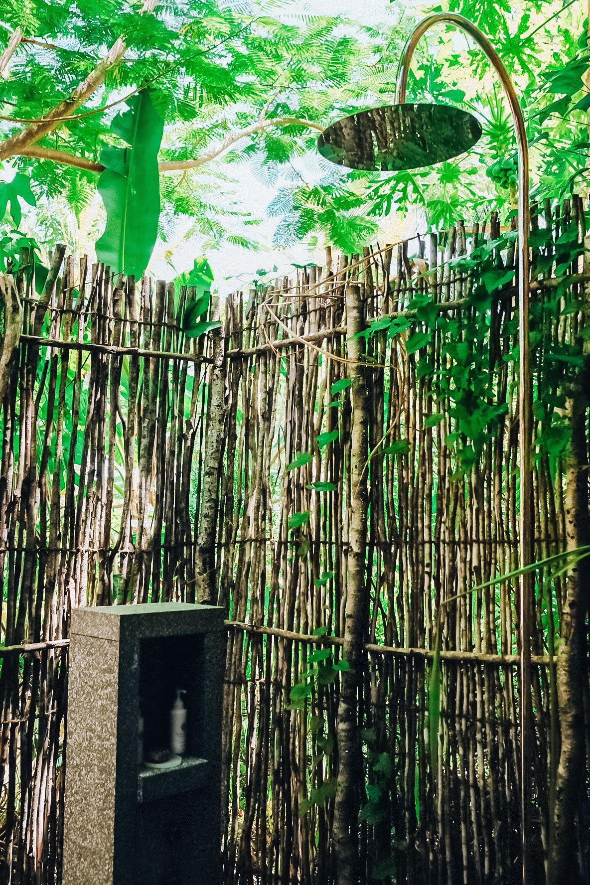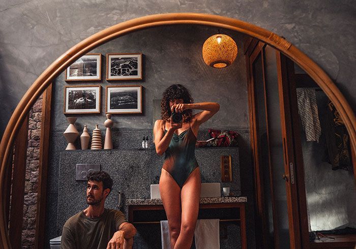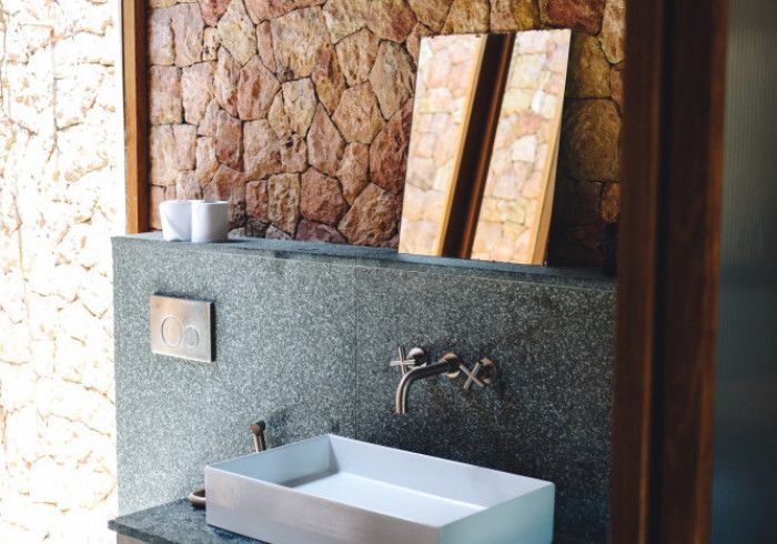 features indulgent indoor + outdoor showers + AC + nespresso machine + kettle + king sized coco-mat mattress, a few of shahi's favourite books and a record player.